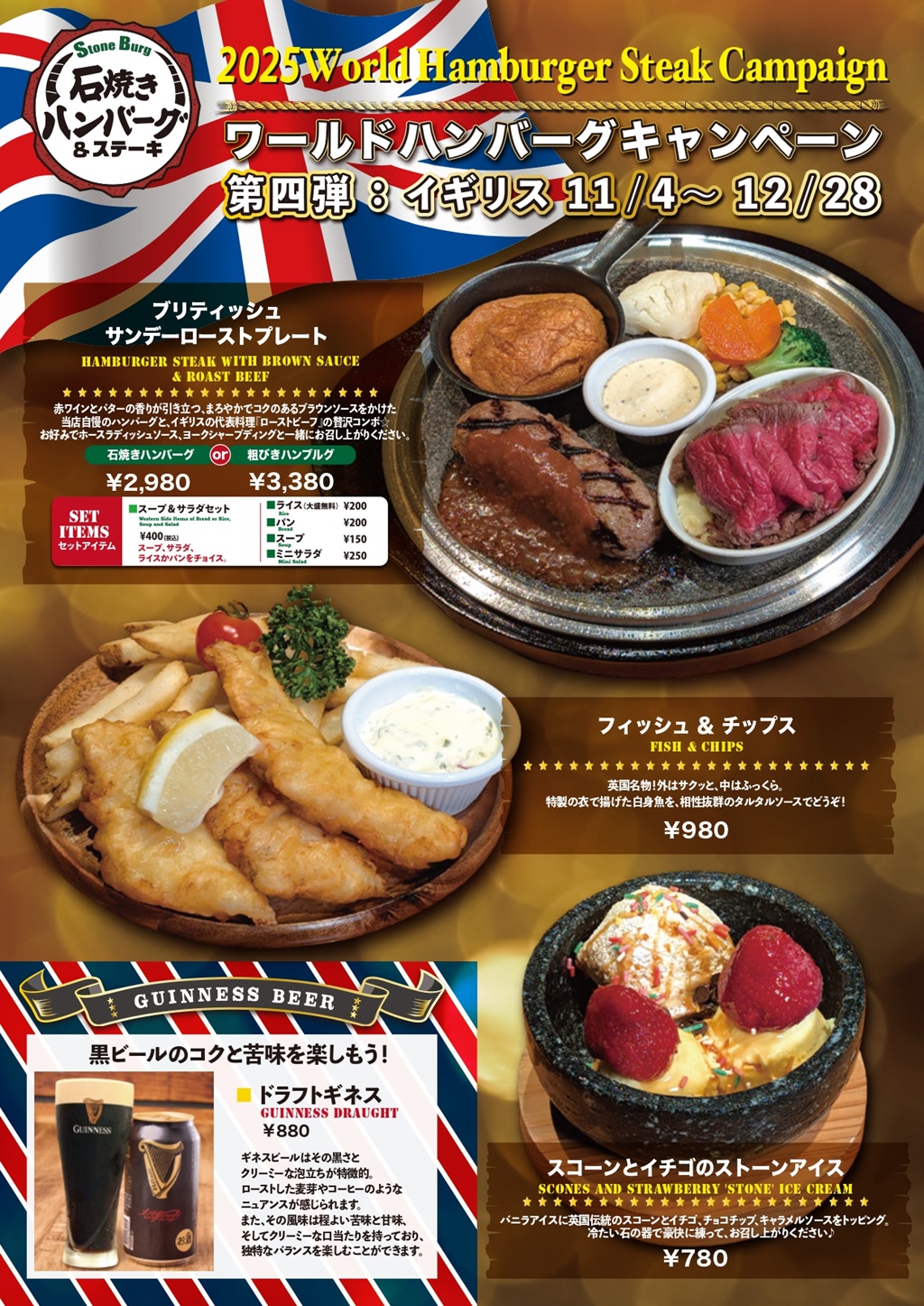キャンペーン第4弾は、イギリスをテーマに、ブラウンソースをかけたハンバーグとイギリスの定番料理・ローストビーフを組み合わせた「ブリティッシュ サンデーローストプレート」のほか、「フィッシュ&チップス」、「スコーンとイチゴのストーンアイス」をご用意し、お客様をお迎えします。
